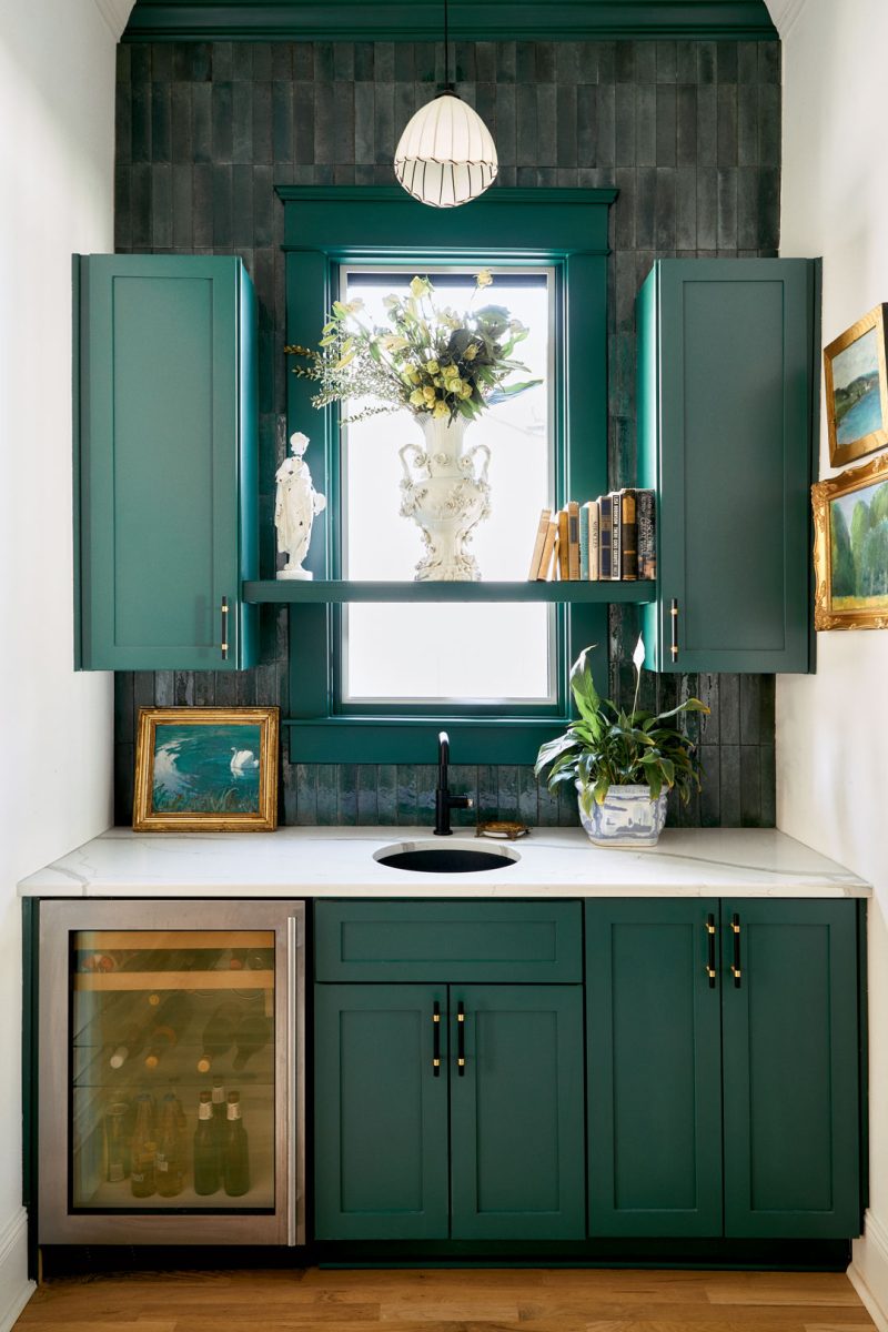 The designer replicates many of the same materials used in the kitchen, including sherwin williams green paint by swerwin williams champion cabinetry, charte hardware bronze and matte black pulls and quartz countertops. A small sink with a Delta Faucet Matte Black Faucet makes cleanup easy, while a built-in refrigerator keeps drinks cold. Maros put together a small shelf in front of the window so his clients could have some display space.